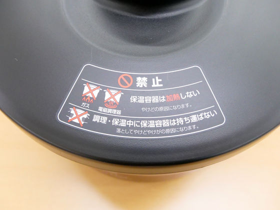 保温容器のフタには、「保温容器は加熱しない」「調理・保温中に保温容器は持ち運ばない」などの注意書きが記されています。
