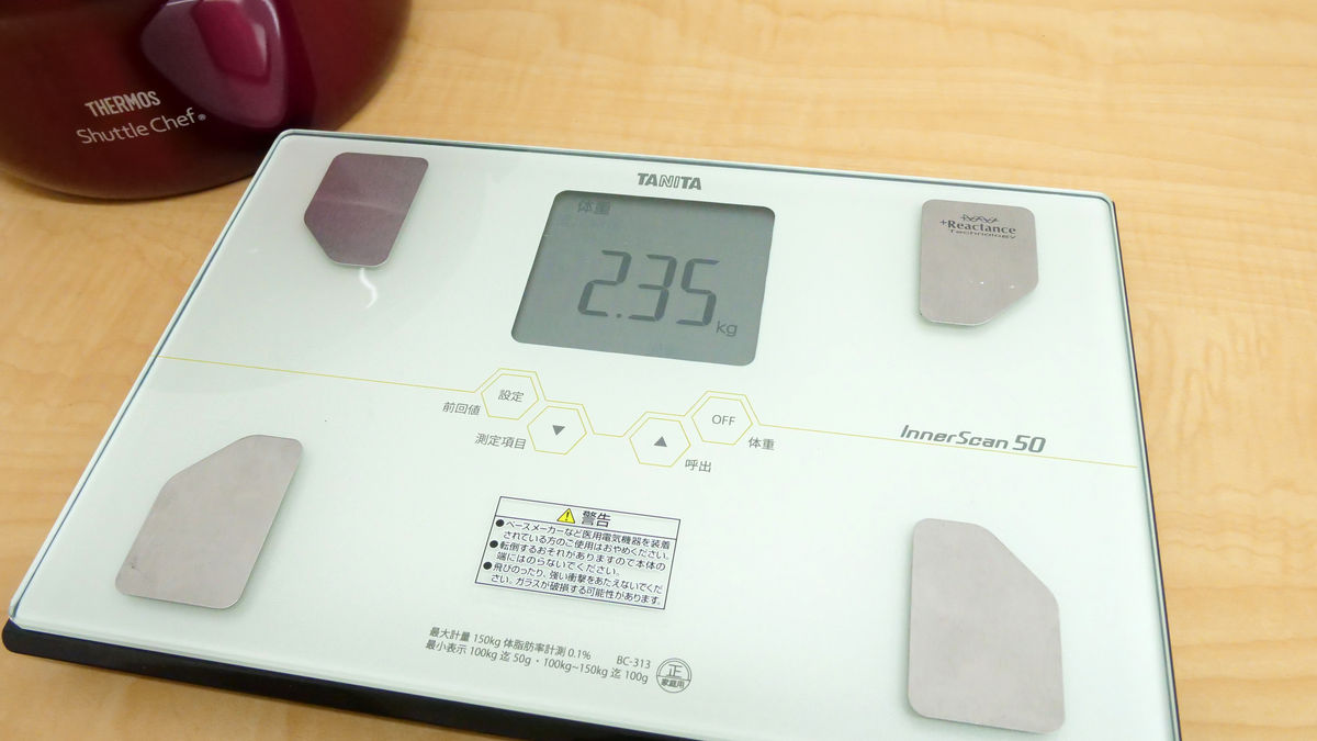 保温容器、調理鍋を含めた全体の重量は実測で2.35kgでした。