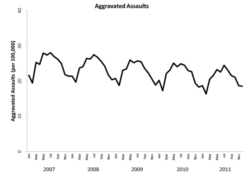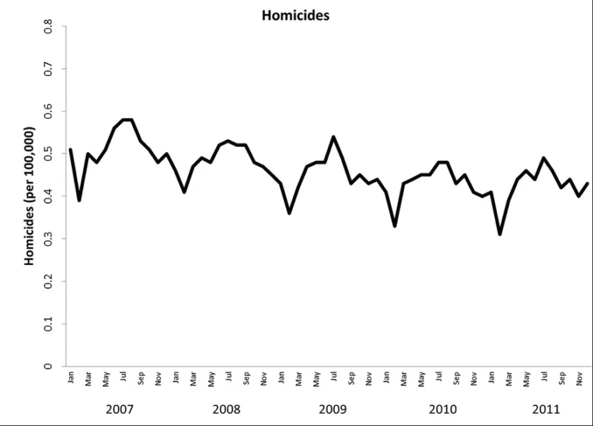 その結果、興味深いことに、CoDの売り上げが急激に高くなる10~12月頃(リリース時期は10月末か11月初め)に、殺人や暴行などの犯罪数が減少していることが判明
