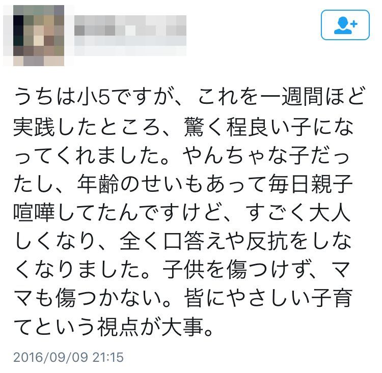 うちは小5ですが、これを一週間ほど実践したところ、驚く程良い子になってくれました。やんちゃな子だったし、年齢のせいもあって毎日親子喧嘩してたんですけど、すごく大人しくなり、全く口答えや反抗をしなくなりました。