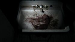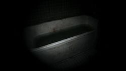 P.T. begins with a cutscene that shows the protagonist waking up in a dark hollow room. The protagonist then gets out to find a narrow, L-shaped hallway which appears to be in a loop. The hall is also connected to a bathroom containing a moving fetus in the sink.