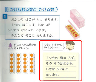 「しきは,4×5かな,5×4かな…」という疑問に対して,「1つ分の数は5で,その4つ分だから,しきは5×4になります。」と書かれている。すなわち,「4×5は間違い」だと。先程のWikipediaの記事によると,啓林館の算数の教科書の指導書には,6年生であっても「式の意味(項の順番)をしっかりと意識させることが大事だ」と書かれているようなので,そういう方針なんだろう。