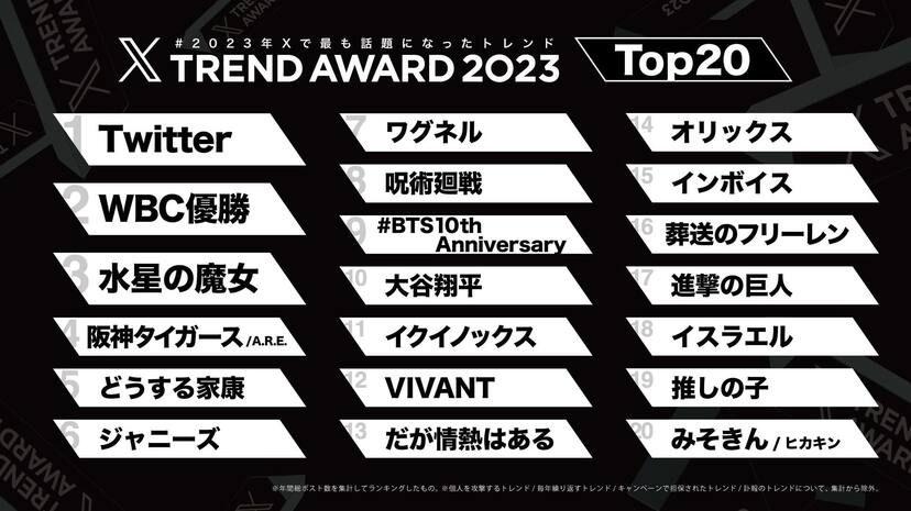「#XTrendAward」(旧: #Twitterトレンド大賞)とは2023年にXに日本語でポストされたなかから、最も話題になったトレンドワードTOP20、ジャンル別のトレンドワードを発表する表彰企画。2023年内にトレンドインした全てのトレンドから「ポスト数」「トレンドイン回数」を測定、それぞれのスコアを合算して選出している。