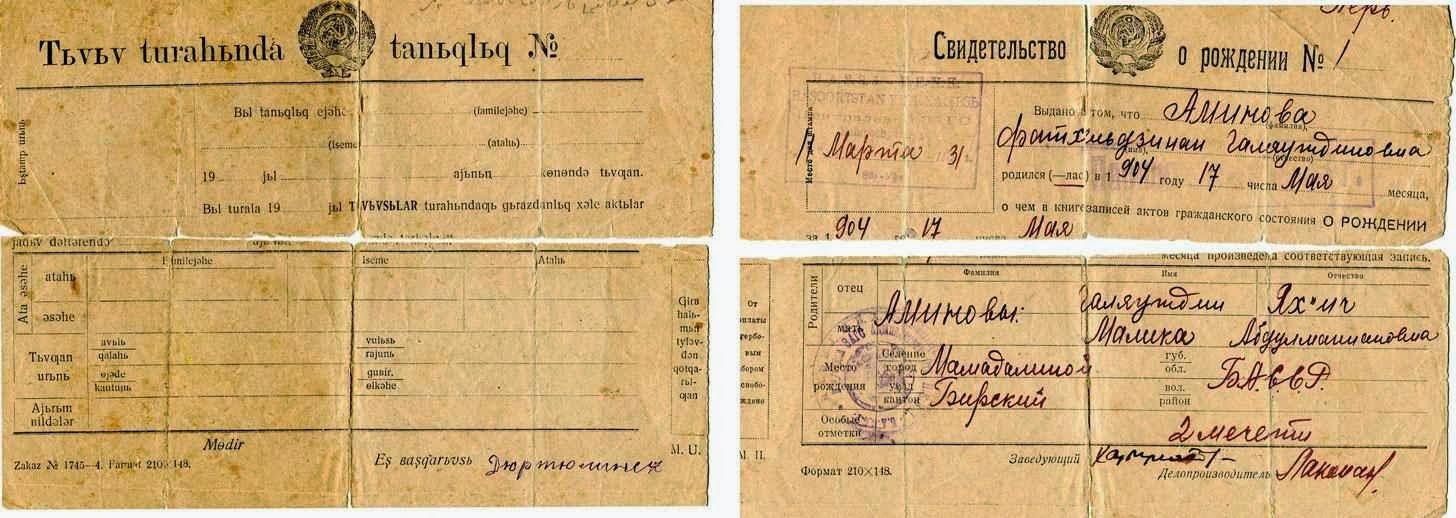 Свидетельство о рождении, датированное 11 Марта 1931 года. Башкирская АССР