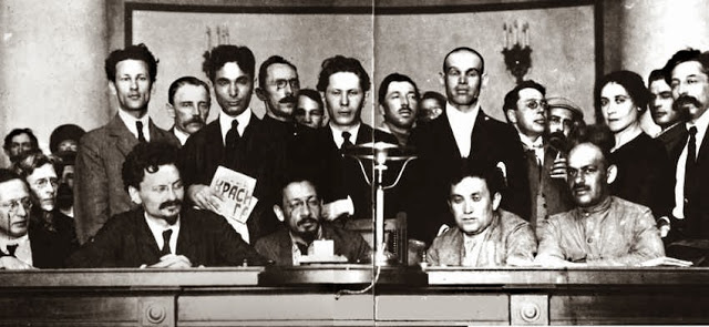 ЦК РКП(б) Л.Д. Троцкий, Л.Б. Каменев, кандидат в члены Политбюро Н.И. Бухарин и