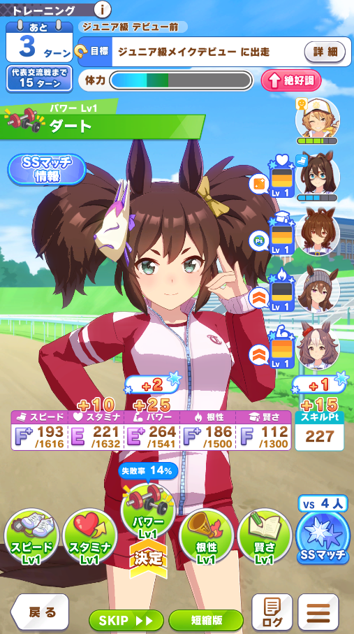 (体力やる気、育成中ウマ娘の能力現在値、パートナーの絆ゲージ)