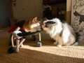 当のアーサーはむしろ迷惑そう。ですが、なついてくるのを邪険に払うこともしません。これで猫4匹、犬1匹。