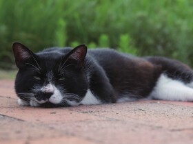 初めての場所なのに、鼻が利くのか、まっしぐらに猫たちのご飯場所へ飛んでゆきます。みんなの皿に頭を突っ込んでは底をなめています。