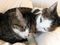 人間にはのどを鳴らしてすり寄りますが、クリス、ココ、ネネには「シャーッ!」。唯一、同じアビシニアンのアーサーには、後ろをついて歩くようになりました。同じ種類なのがわかるのでしょうか。まるで先輩を慕う後輩のようによりそい、アーサーが顔を洗えば自分も洗う。アーサーが香箱を組めばすかさず隣で組む、という調子。