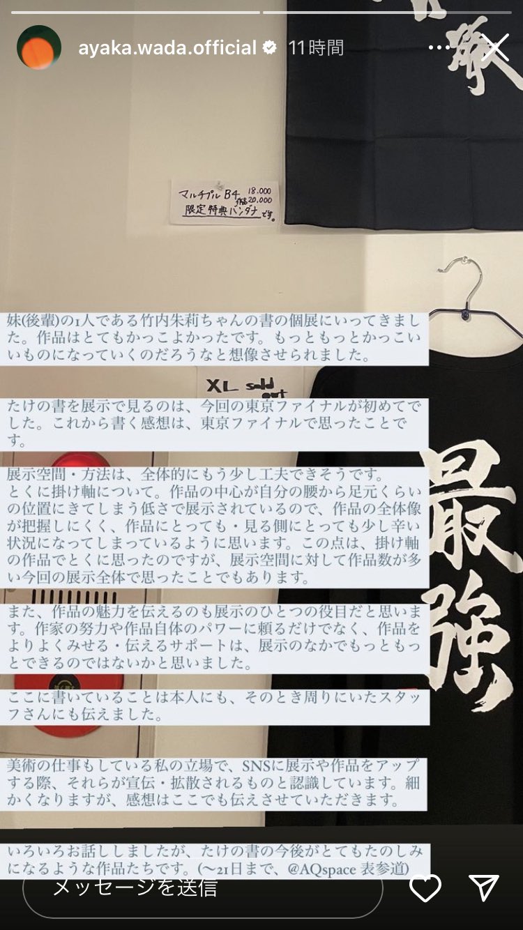 美術の仕事もしている私の立場で、SNSに展示や作品をアップ する際、それらが宣伝・拡散されるものと認識しています。細 かくなりますが、感想はここでも伝えさせていただきます。
