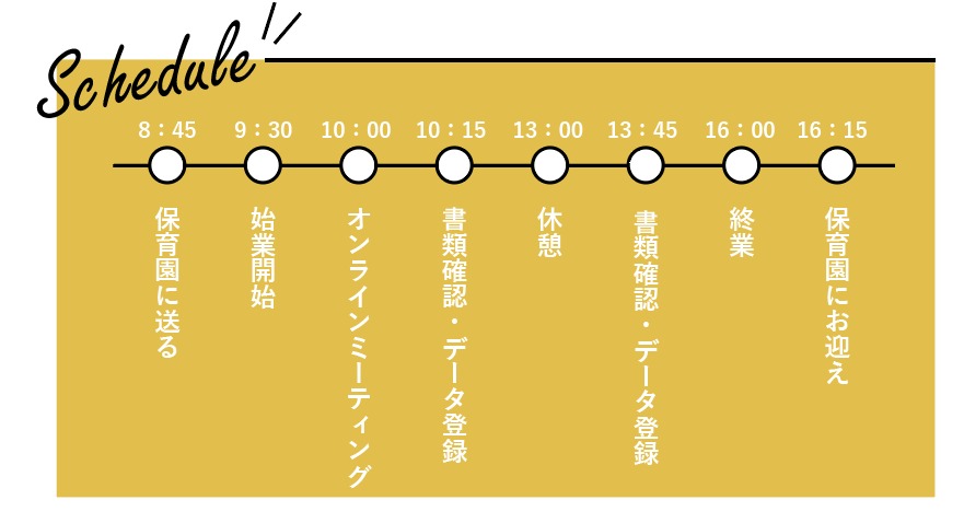 子供はまだ1人で遊べるような年齢ではないので目を離せず、仕事に集中出来ないことも多いので、主人の都合に合わせて出勤を減らしたり半休にしていました。