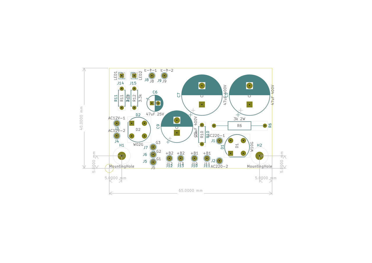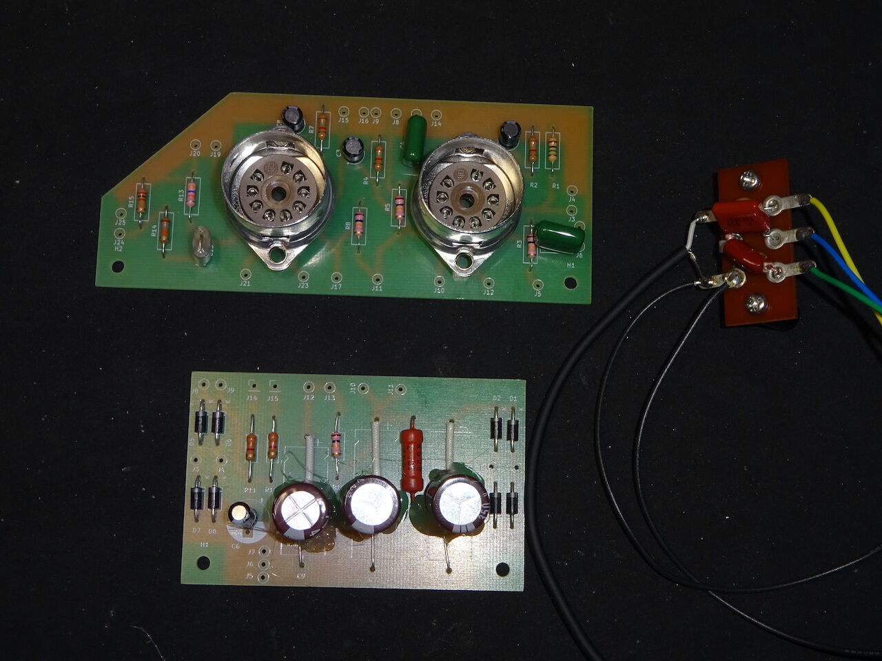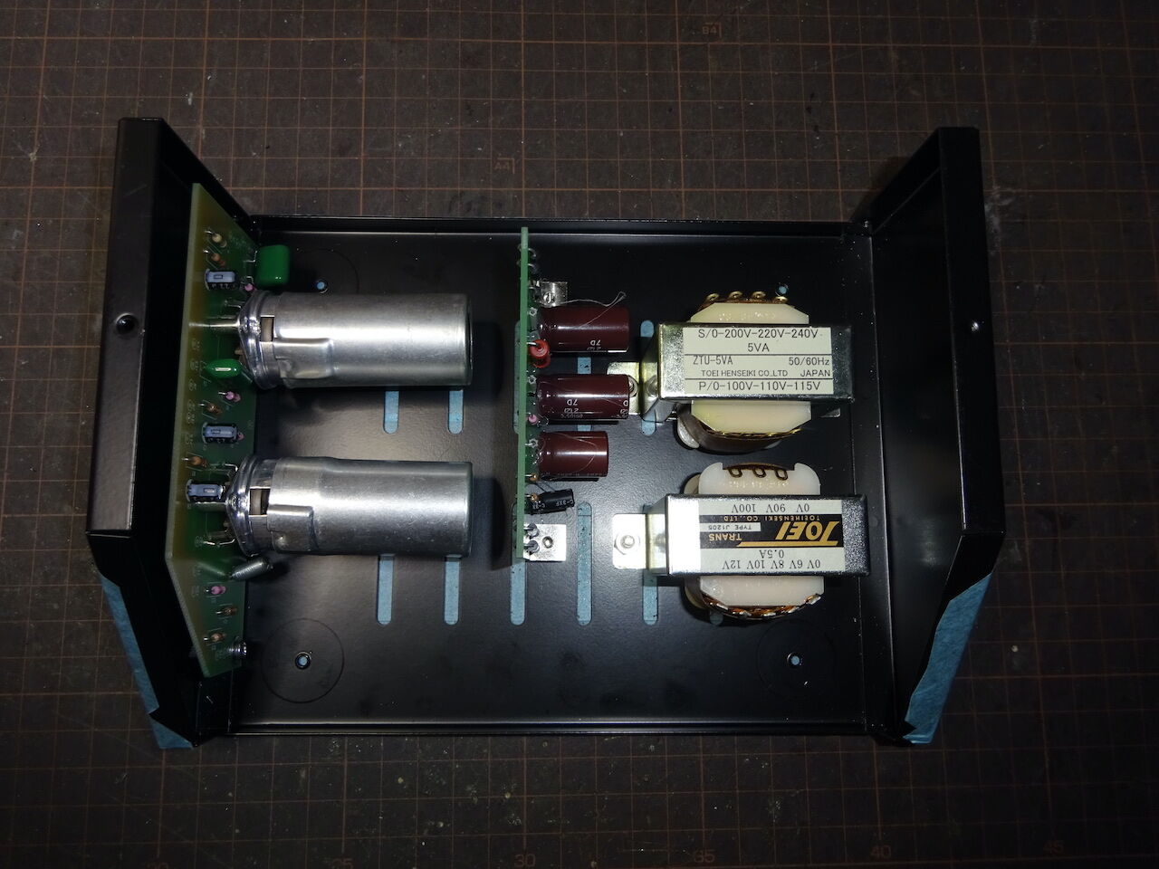 電源トランス、ヒータートランスから電源基板(手前)に撚り線(赤と青)で