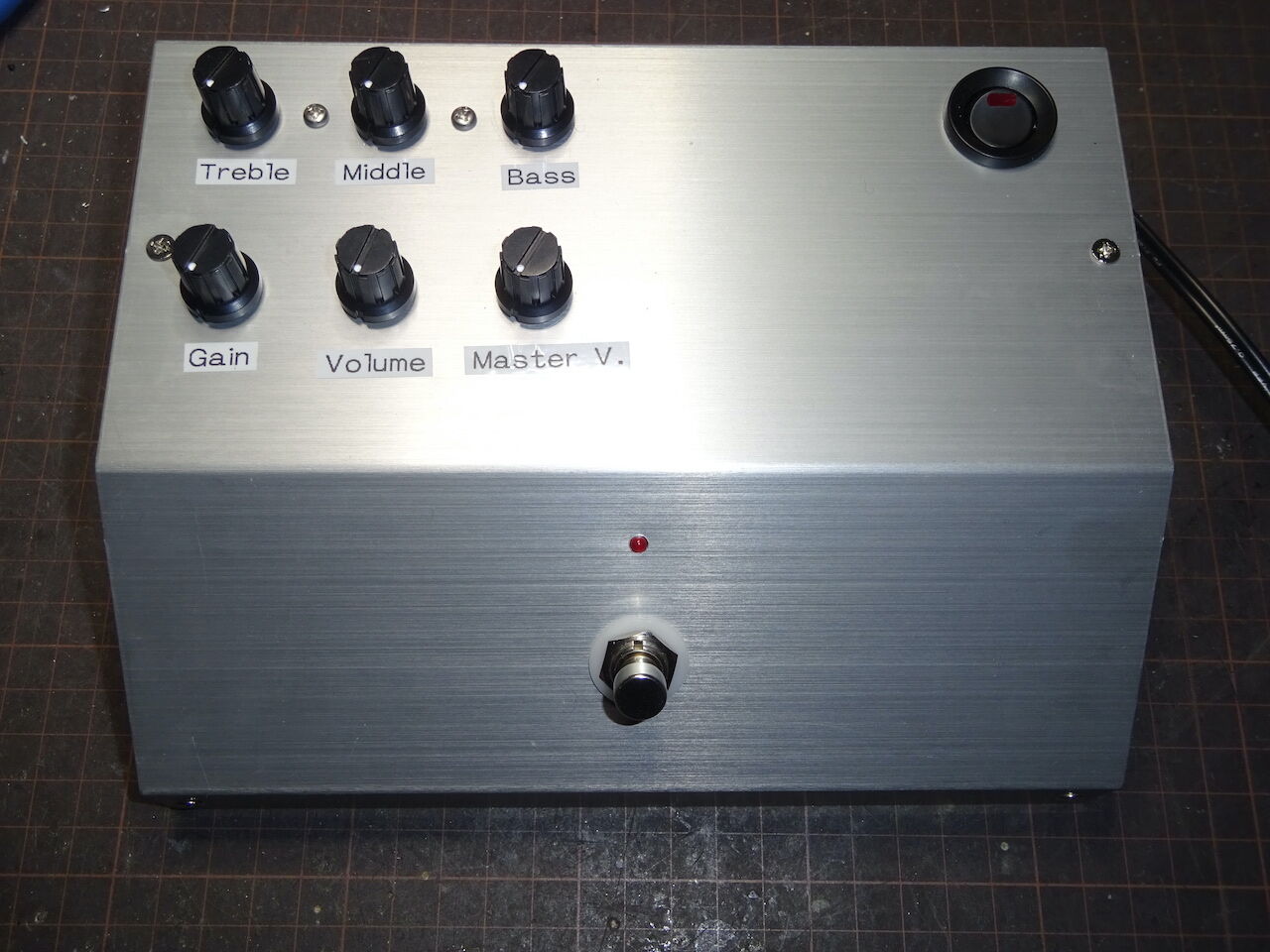 上段の右から Treble, Middle, Bass の順。下段左は Master Volume。