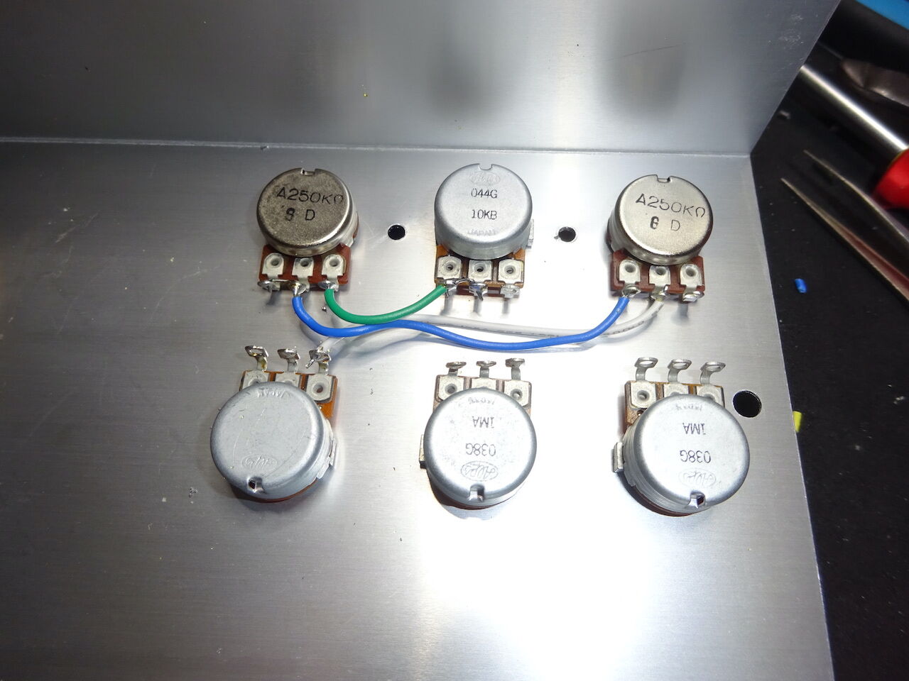 あとで気がつきましたが、写真の右上の Treble のポット(250kA) の配線が