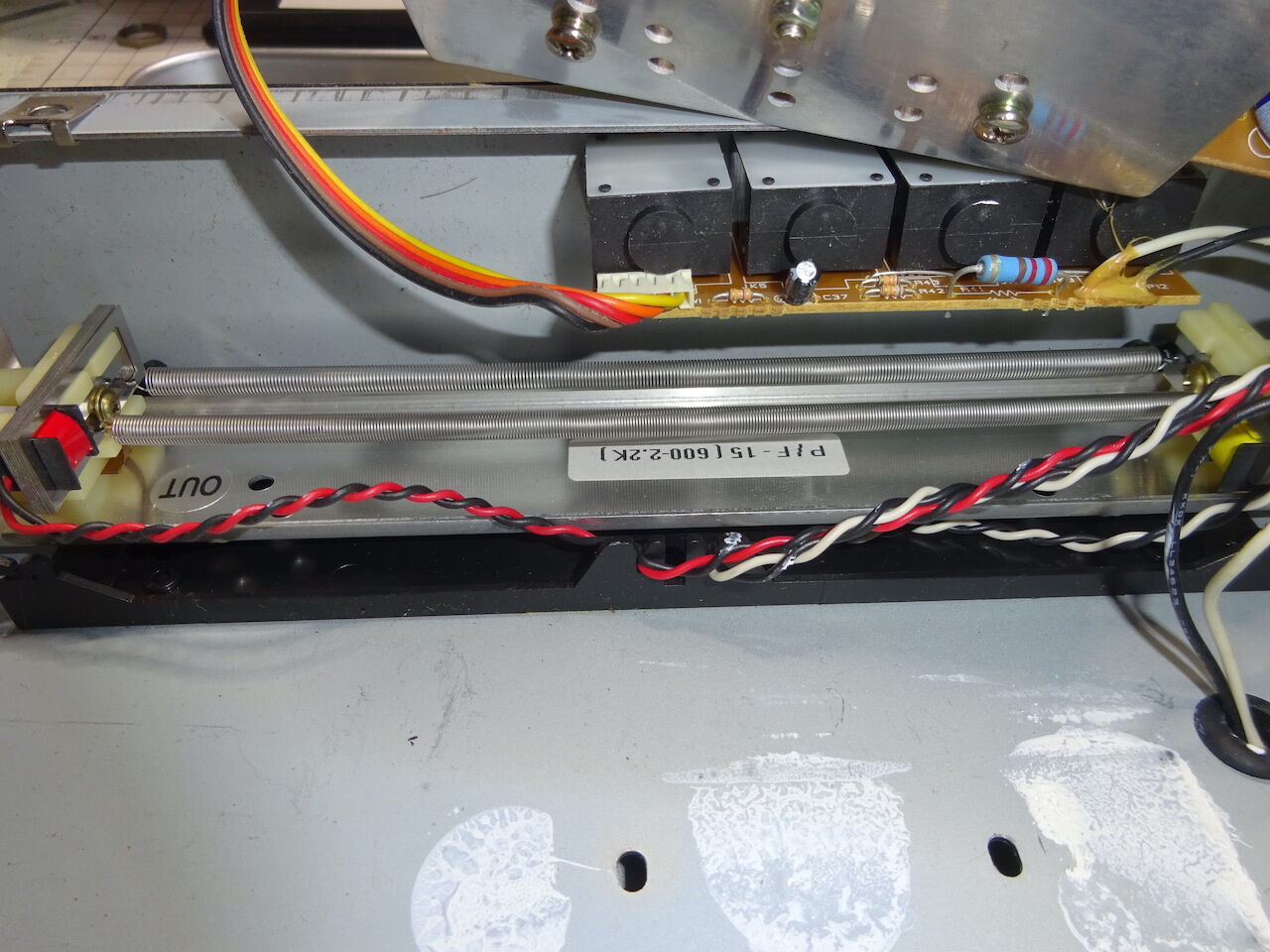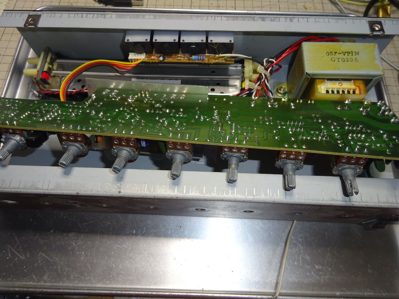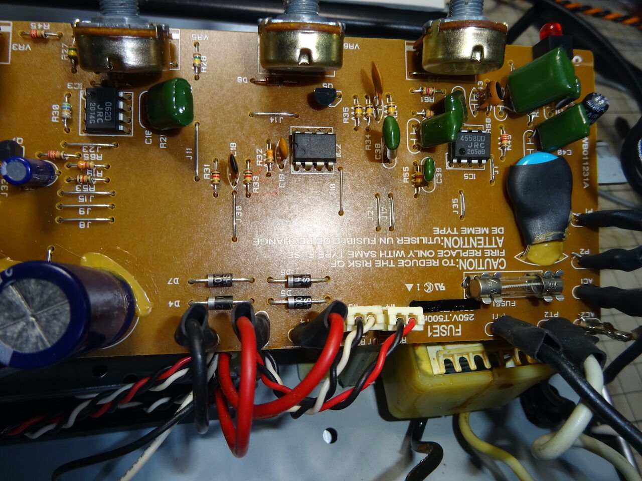 左下が電源トランス GT0206, 中央に4つのジャックを搭載した基板、