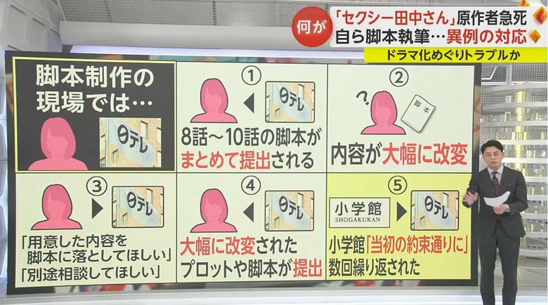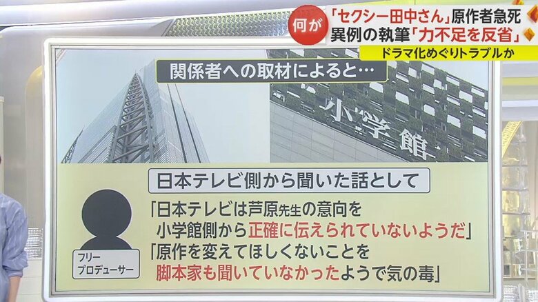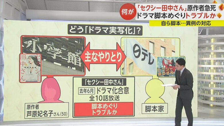 原作者の芦原さんが手がける「セクシー田中さん」は、小学館から発行されている。ドラマ化したのは日本テレビで、制作にあたっては脚本家が脚本を書いている。双方の主なやり取りというのは、日本テレビと小学館の間で行われていたとみられている。