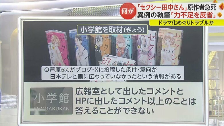 一方、小学館側だが、芦原さんがブログやXで投稿した条件や意向が、日本テレビ側に伝わっていなかったという情報があるという点について確認したところ、「広報室として出したコメントとHPに出したコメント以上のことは答えることができない」という回答だった。