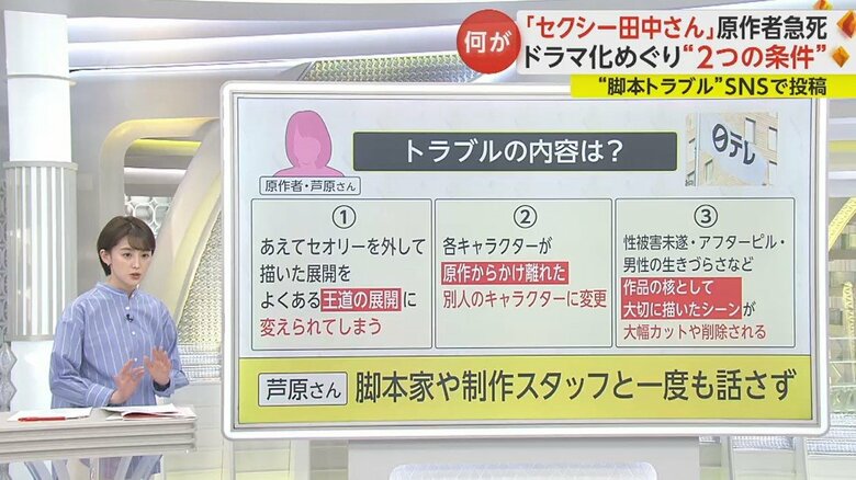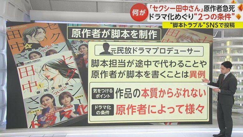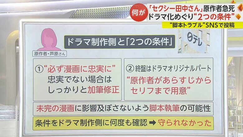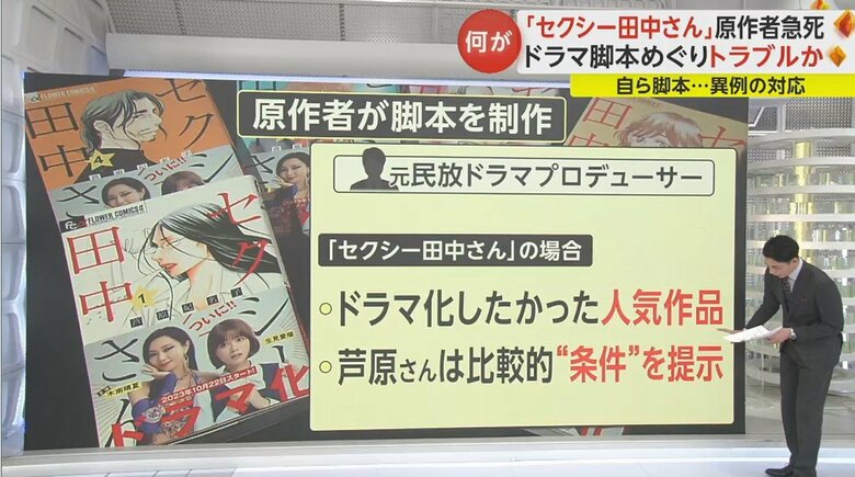 元民放のドラマプロデューサーによると、今回の「セクシー田中さん」については、多くのテレビ局がドラマ化をしたかった人気作品で、原作者の芦原さんは比較的、条件を提示される方と言う印象を持ったという。