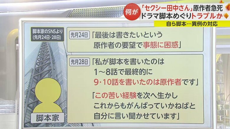 12月28日には「私が脚本を書いたのは1~8話で最終的に9・10話を書いたのは原作者です」「この苦い経験を次へ生かしこれからもがんばっていかねばと自分に言い聞かせています」などと投稿していた。
