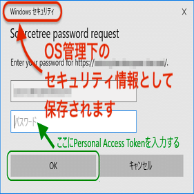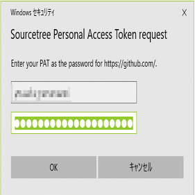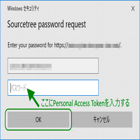 【2】Sourcetreeでは、パスワードを入力する欄にPersonal access tokenを入力する必要があり、ここが最重要ポイントです