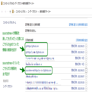 また、「git for Windows」をインストールしている際には、そちら経由で保存された情報が原因なことがあります。この際には資格情報マネージャーより、同様に「gitで始まる情報」も削除します