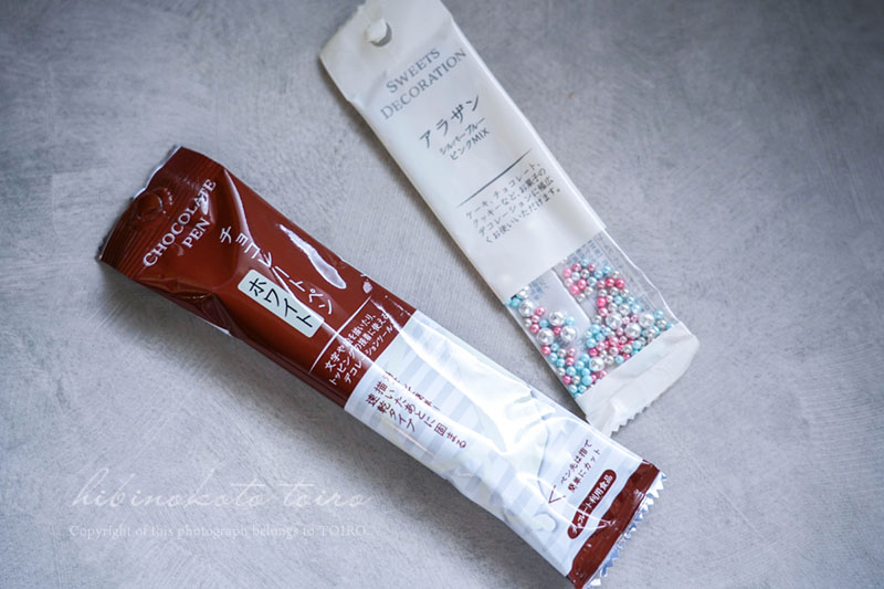 100円ショップのセリアに売ってるチョコペンやトッピングシュガーなど、お好みのものを用意してください。