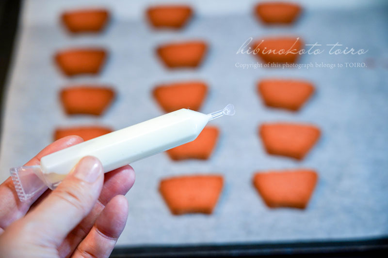 オーブンシートに乗せたまま、出来上がったラスクの外側から斜めにチョコを絞る!!