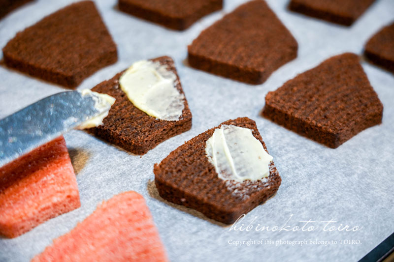 チョコバウムの方には、常温に戻しておいたバターを半分だけ塗っていきます。