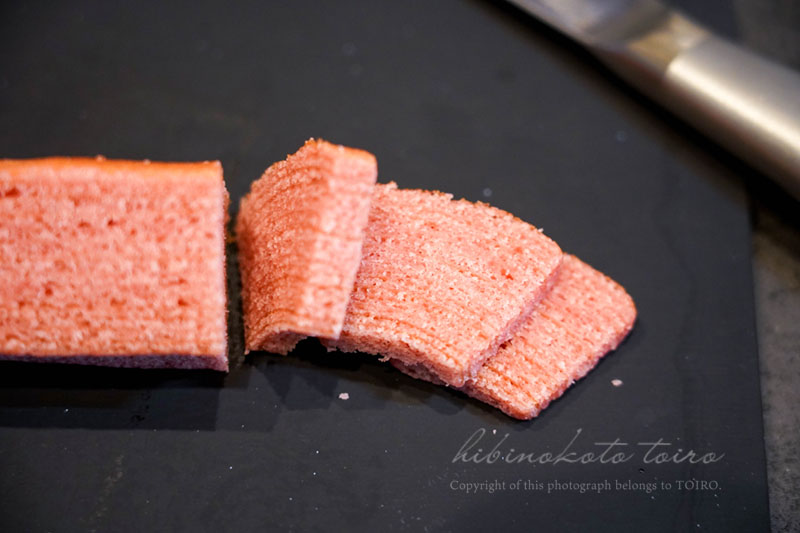まずはバウムクーヘンのカット。5ミリ厚さに切っていきます。