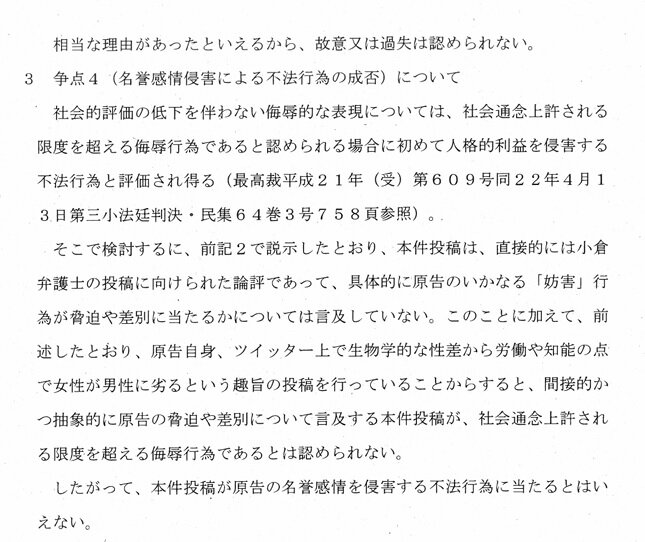『本件投稿は、直接的には小倉弁護士の投稿に向けられたものであり、その内容が脅迫又は差別に当たりうると論評するものであるが』