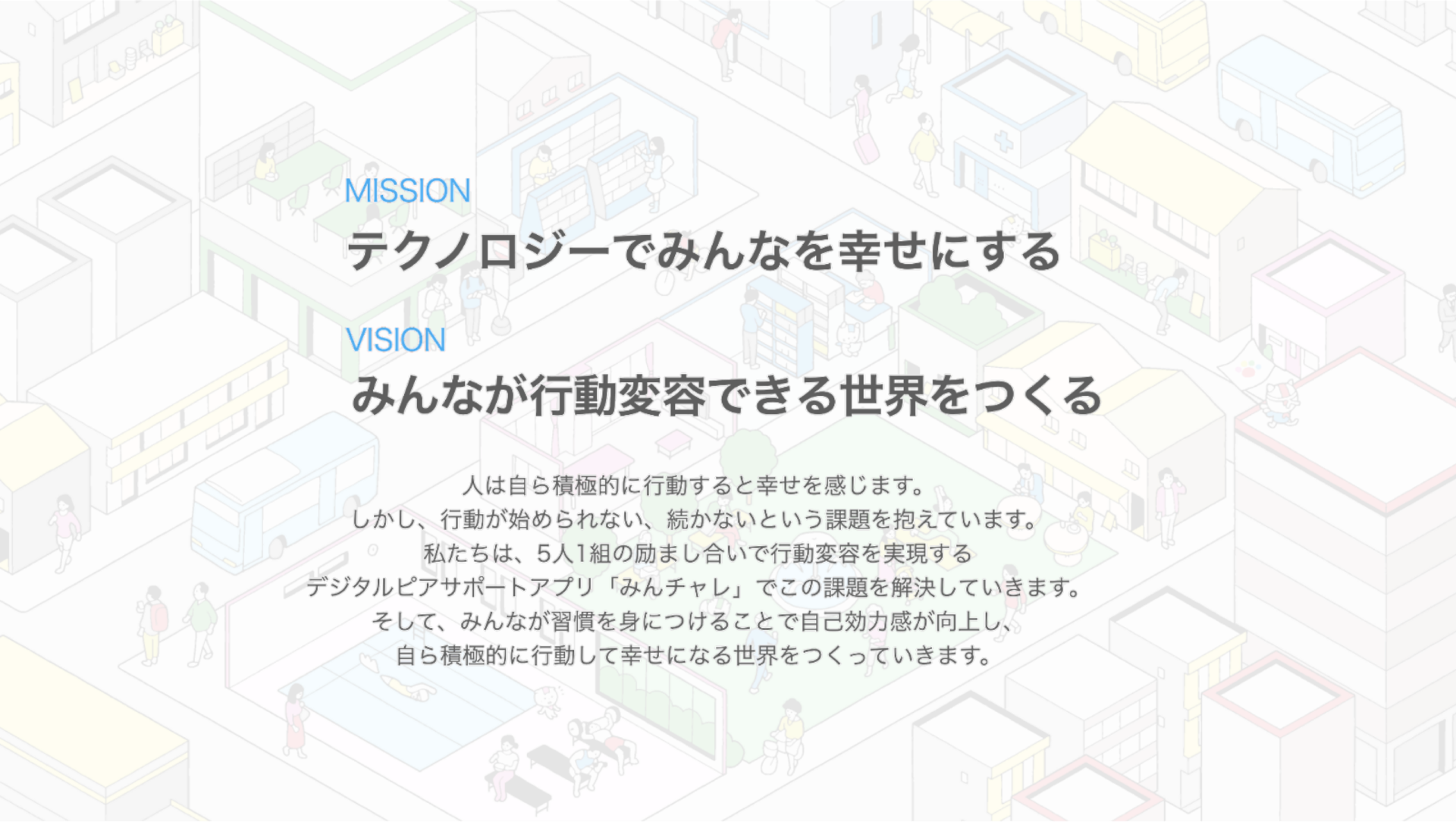 私たちは「テクノロジーでみんなを幸せにする」というミッションのもと、習慣化アプリ「みんチャレ」を通して「意欲はあっても、いざ始めるとなかなか続かない」という人たちの目標達成をサポートしています。