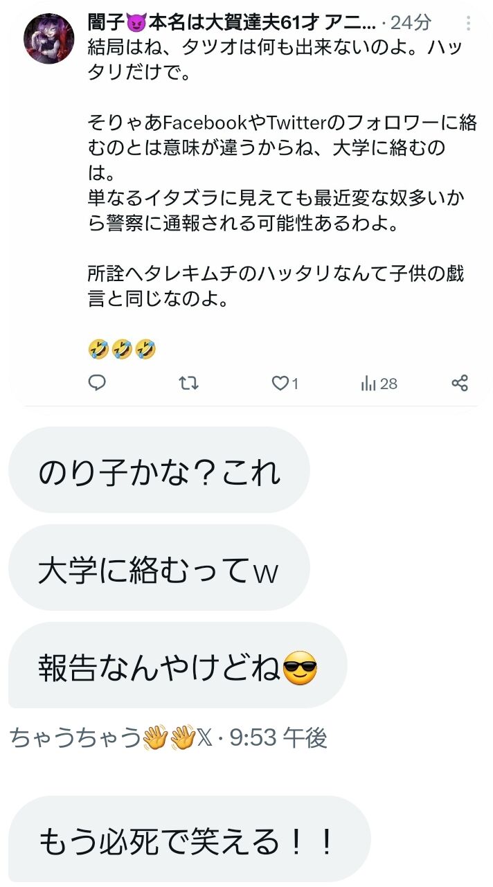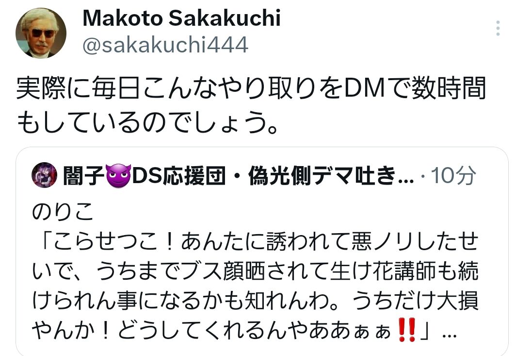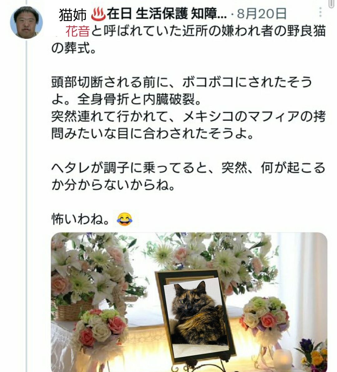 ねこだ「ほんと理解力0ですよね。こちらは別にイタズラをするんじゃないんです。京都女子大学で華道部の生け花講師をやっている人物が、実はツイッターの中ではこんな悪ふざけをやっていますよと、事実のみを然るべき機関に報告するんです」