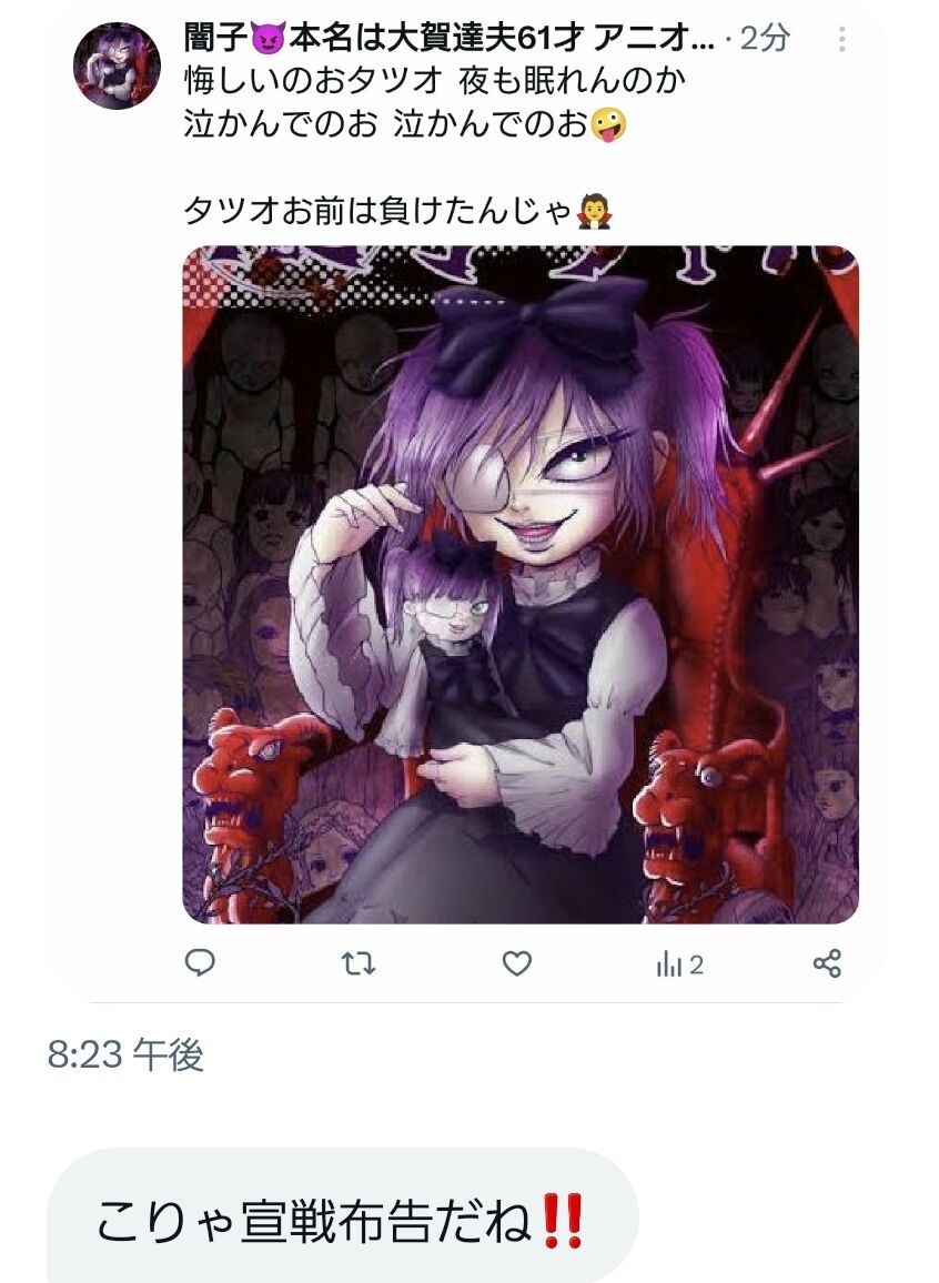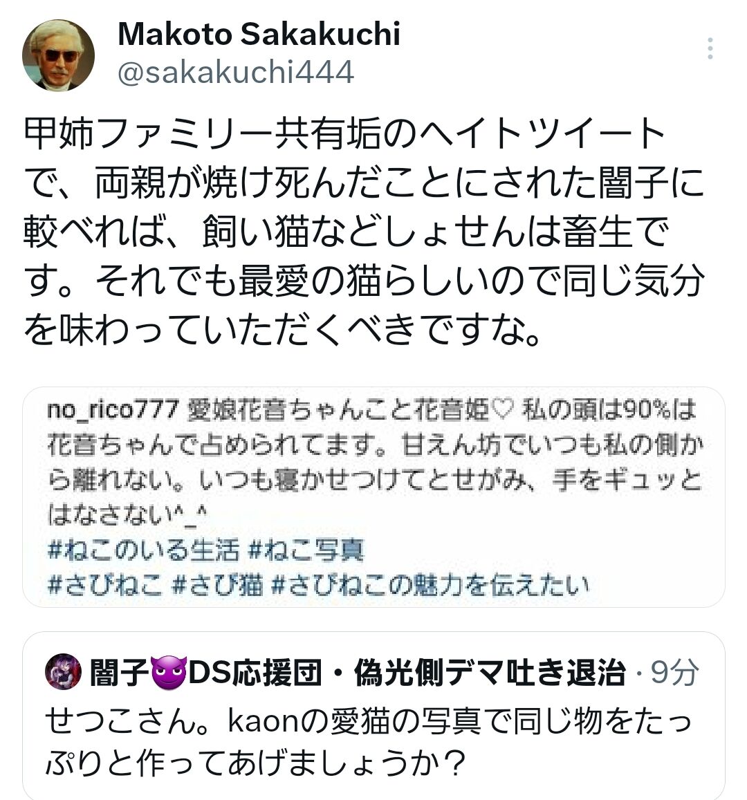 闇子「せつこさん。今回はこの程度にとどめておきましたが、以後、人の親をネタに行き過ぎたツイートをした場合、報復としてもっとキツイのいきますよ。あなたが嫌な思いをするのではなくkaonが嫌な思いをする事になります。要するに本人ではなく連帯保証人にサラ金の追い込みがかかるような物です」