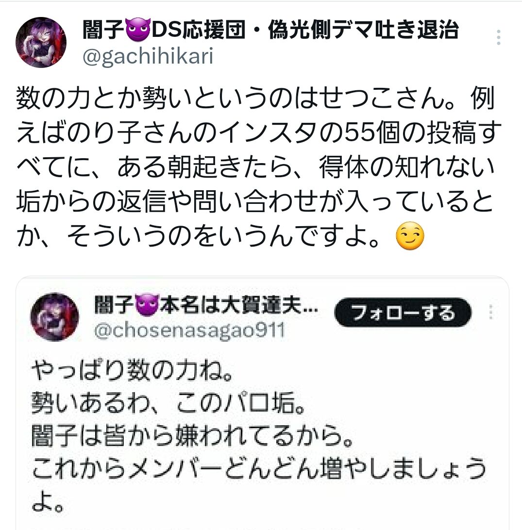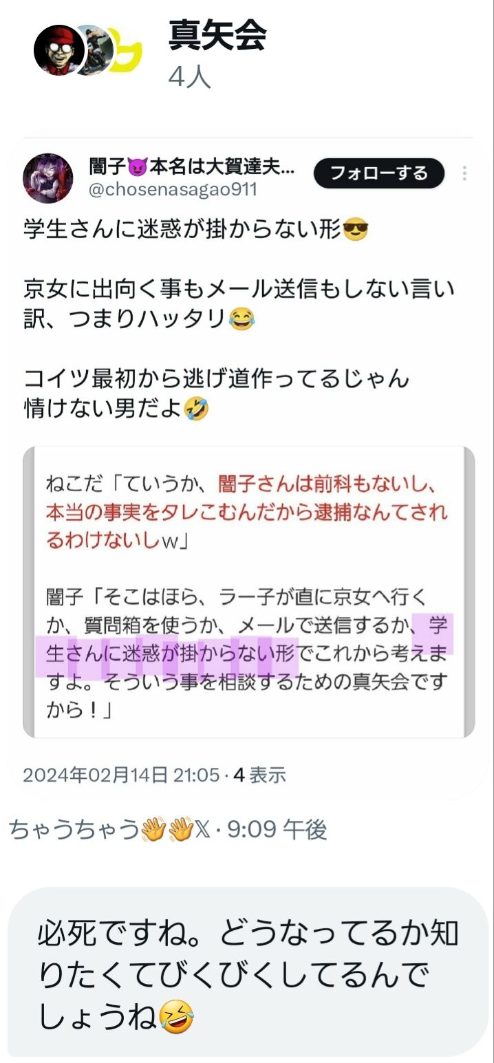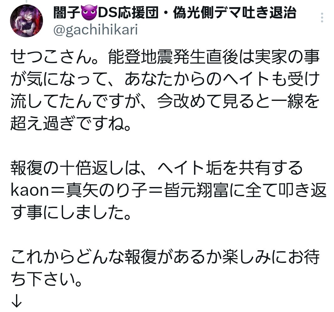闇子「ではここからは非常に重要なことを言います。正月の行き過ぎたツイート、これはせつこさん、全てあなたが書いた物ですか?『自分が書いた』と認めればkaonや他のメンバーには連帯責任は問いません。あなただけに報復をします。誰が書いたかを明らかにしない場合は、ヘイト垢をフォローして共有していると思われるメンバー全員に連帯責任を取っていただきます。さあ、ここで貴方は仲間を守ることができますか?」