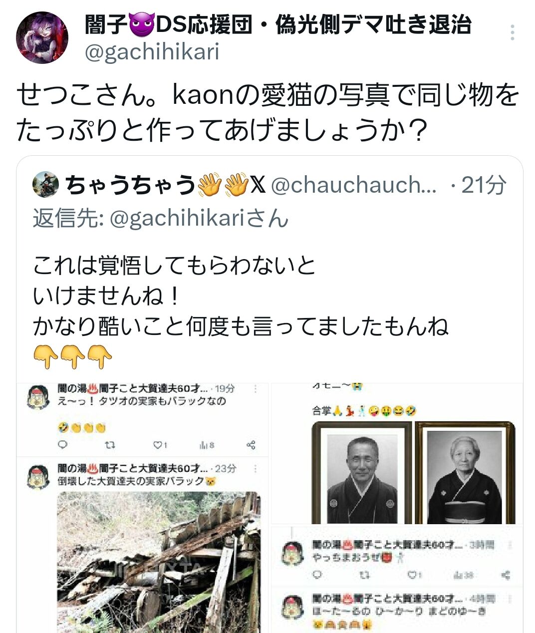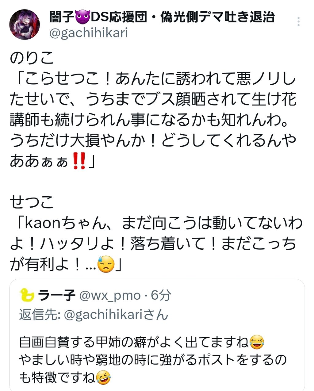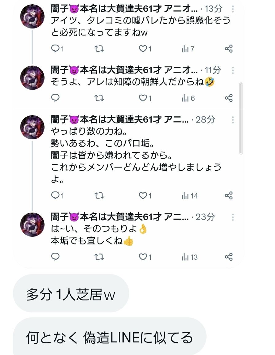 闇子「ではここからは非常に重要なことを言います。正月の行き過ぎたツイート、これはせつこさん、全てあなたが書いた物ですか?『自分が書いた』と認めればkaonや他のメンバーには連帯責任は問いません。あなただけに報復をします。誰が書いたかを明らかにしない場合は、ヘイト垢をフォローして共有していると思われるメンバー全員に連帯責任を取っていただきます。さあ、ここで貴方は仲間を守ることができますか?」