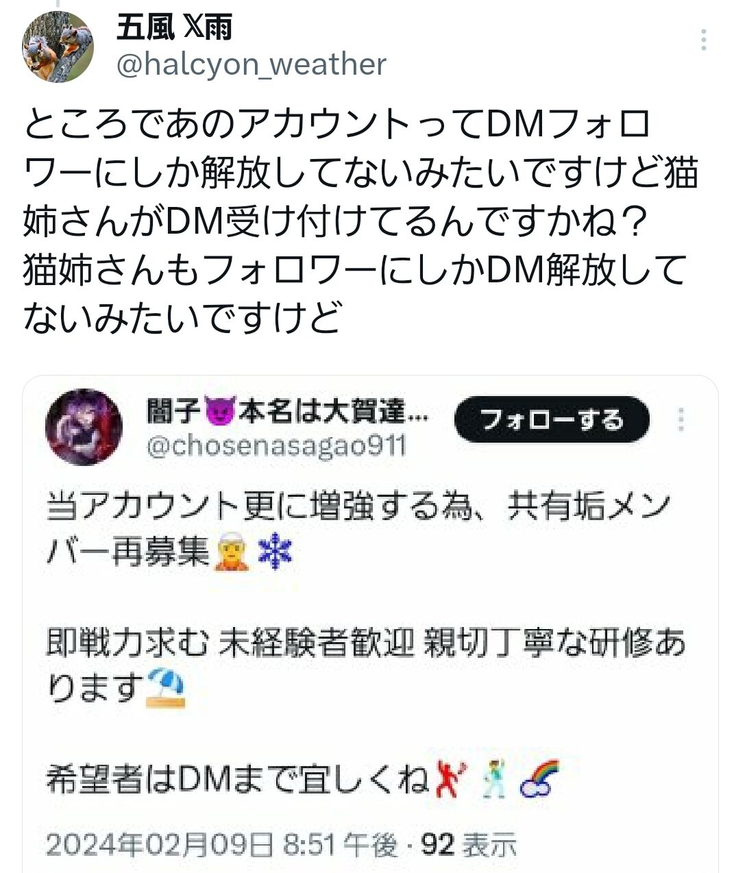 闇子「メンバー募集と書いてある以上、ヘイト垢をフォローするという事は共有メンバーと見なされ、共有である以上はすべてのツイートに連帯責任も負うという事です。全てのことを疑われます」