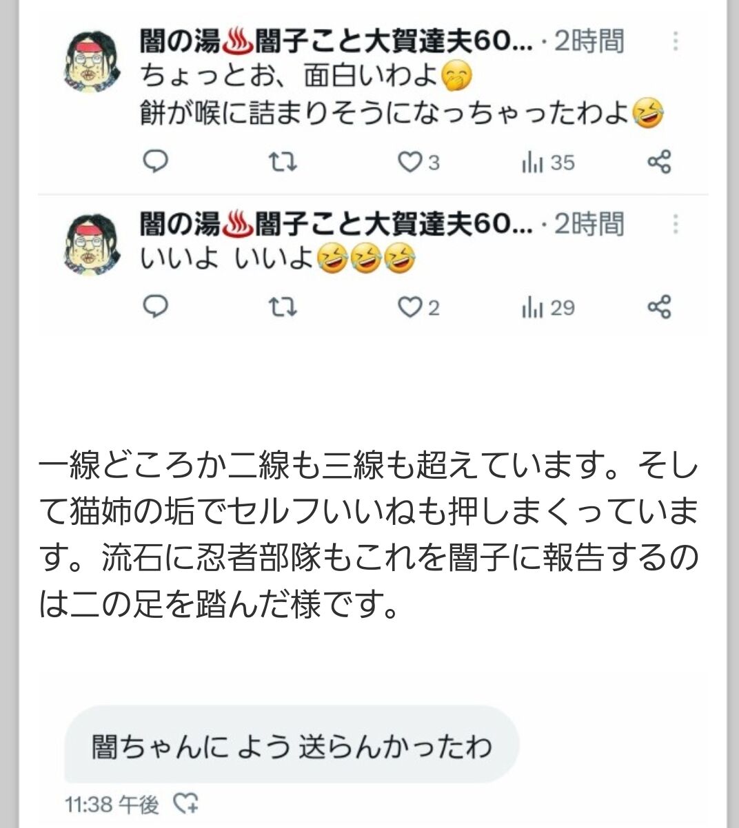 闇子「そこは開示請求をかけないと物的証拠は得られません。ただですね、これは誰が書いたかではなく垢を共有しているファミリー全体の連帯責任となります」