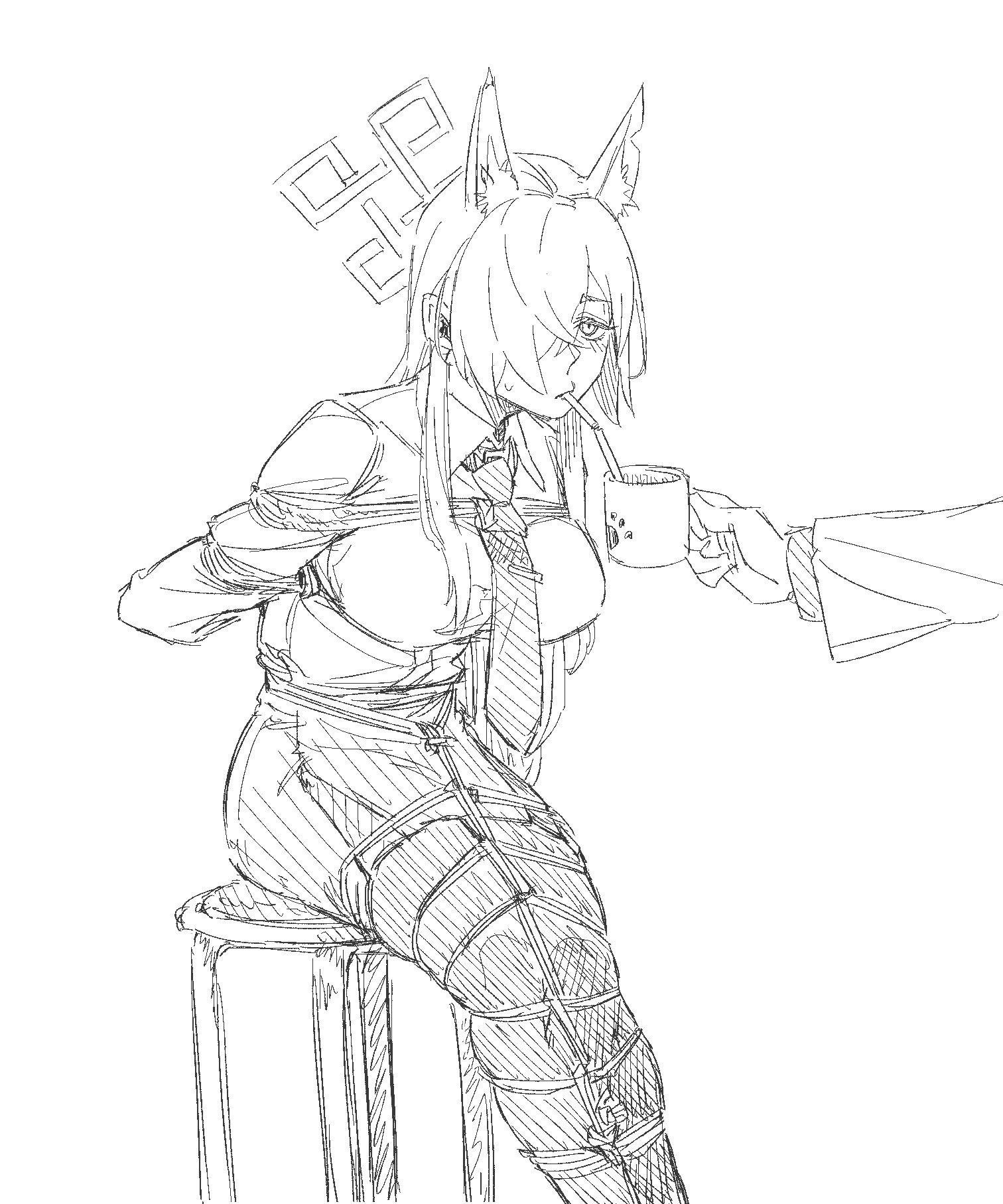 少ない線なのに髪飾りの花や汗をかいたドリンクの描写も細やか!背景の建物もさらっと描いてるようだけどこの角度の屋根ってムズいと思う!ワザマエ!