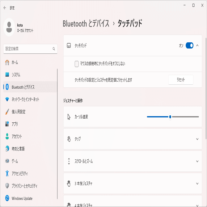 他の部分でも、タッチパッドを無効化できそうな設定項目は見つけられなかった。