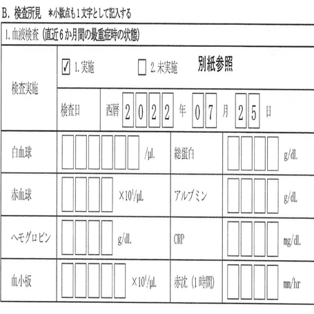 血液検査の結果を記入していない。OCRで読み取る前提の調査票に「別紙参照」と記載するのはありえない。