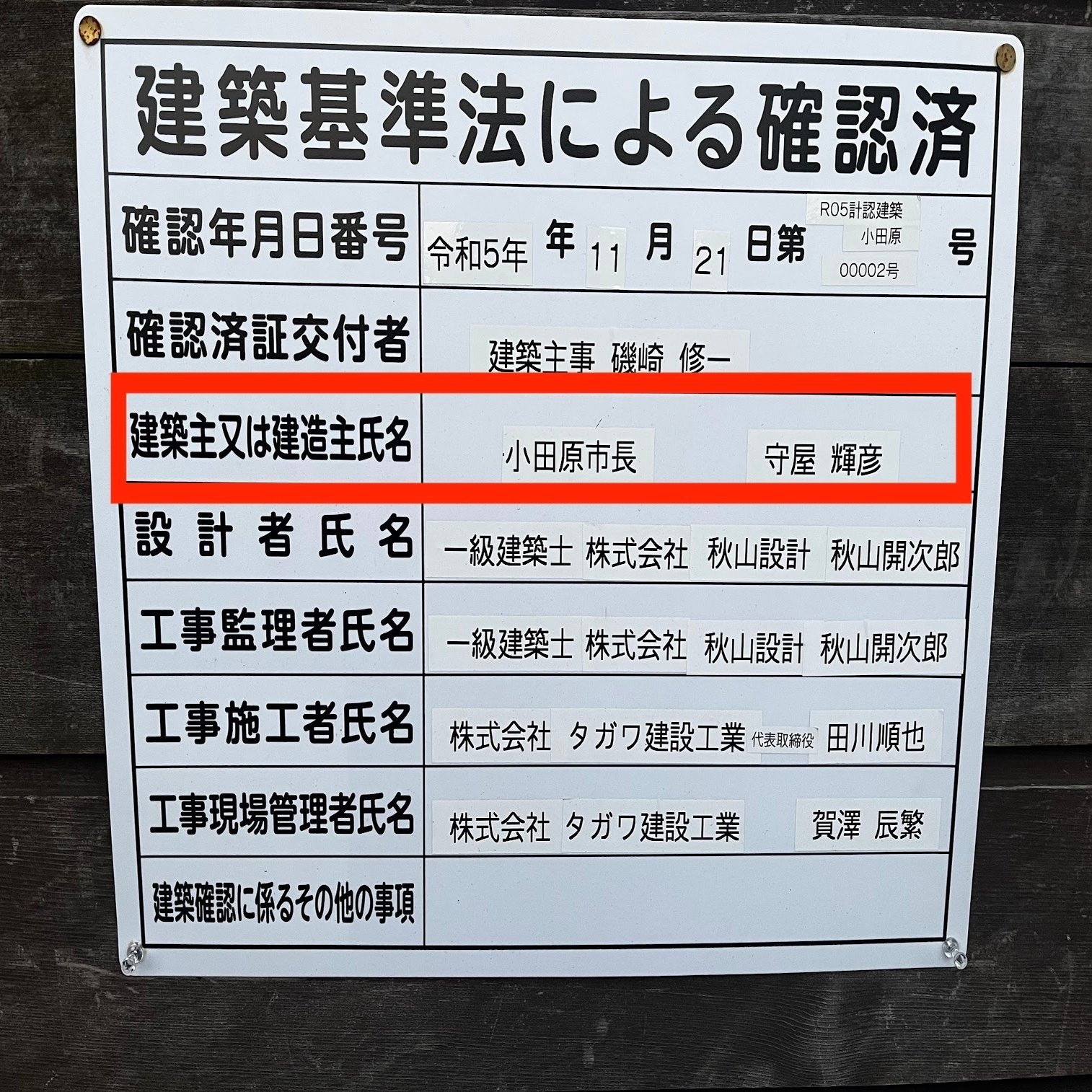 近隣の方から入手した写真によると、増築工事が行われている間、こちらの看板が常に貼り出されていたようです。建築主には明確に「小田原市長守屋輝彦」と記載されています。