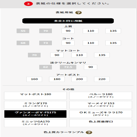 “スタンダードな仕様としてはコート紙・マットコート紙(110kg厚程度)が選択されるケースが多くなります。弊サイトの常設用紙はもちろん、その他お取り寄せも可能ですのでご希望の用紙があればご指定いただけます。”(引用)
