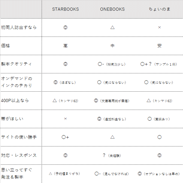 カバー付文庫同人誌の印刷所三社比較(STARBOOKS、ONEBOOKS、ちょいのまレポ)