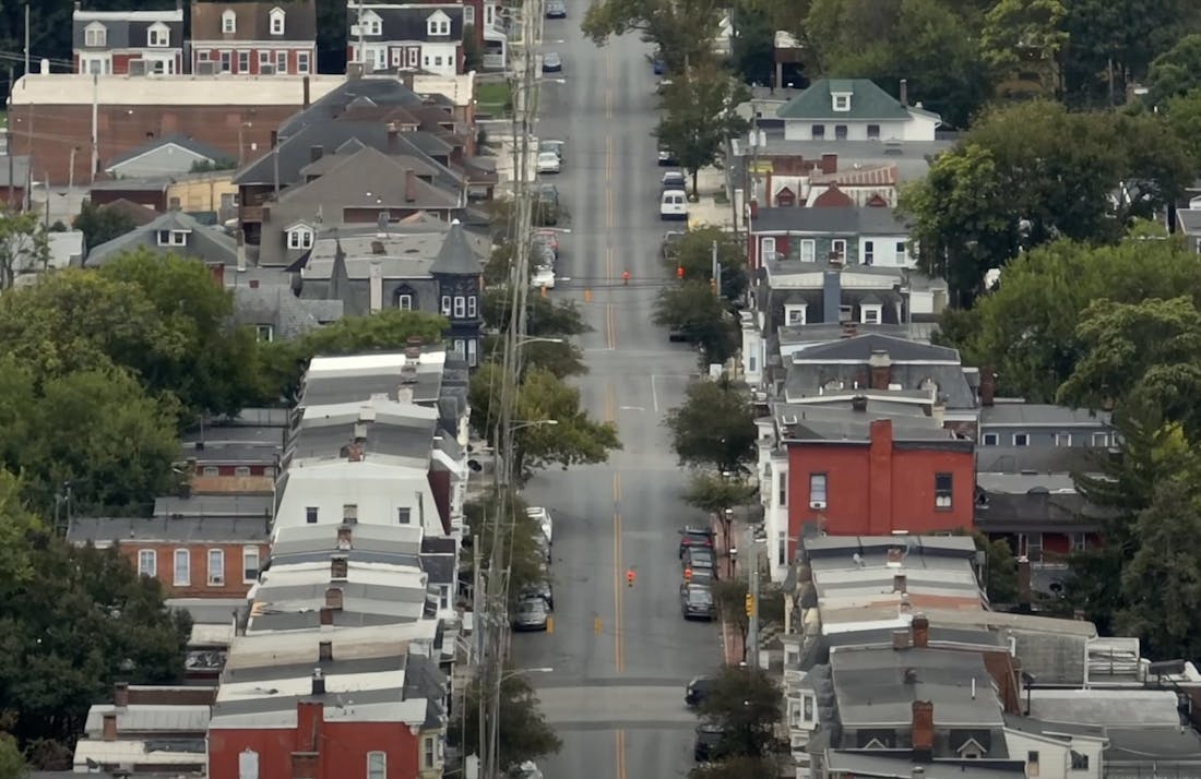 But at 31 seconds, it switches to a panning shot of a neighborhood that looks decidedly not like Minneapolis. It shows tightly-packed row houses and flat roofs, with an atmosphere and ambience more like a city in the Eastern United States.