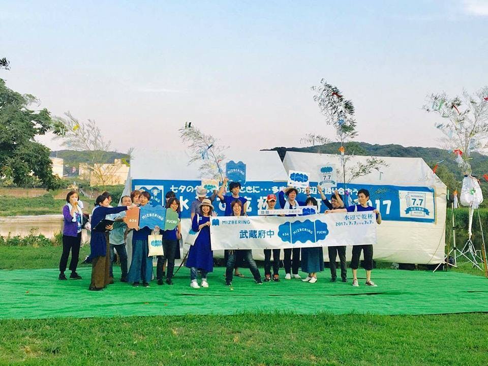 府中とミズベリングとの出会いは、2016年です。京浜河川事務所から周辺市へミズベリング参加への呼びかけがあり、高野府中市長が応じたことが始まりです。2016年6月11日の市長コラムで市長はこう書いています。【「ミズベリング」という言葉 に出会いました。(中略)すなわち、環境保全とまちづくりを水辺で進めようとするものです。本市の多摩川沿岸は約9キロメートル。与えてくれた恵みと今なお残る魅力はかけがえがありません。(中略)7月7日午後7時7分のタナバタイムに青いものを身につけて水辺に集合し乾杯をしようというアクションです。私は郷土の森第一野球場南の水辺に行ってみようかな。府中市長 高野律雄】2016年の水辺で乾杯では、市役所関係者を中心に多摩川沿いに集まり乾杯をしたそうですが、市民には広く知らされず、それを残念に思った市民が、「7月7日の水辺で乾杯の機会を通じて、もっと府中の水辺の魅力を市民が体感できるイベントに企画を膨らませよう」と、いわば「勝手連」のように、実行委員会が立ち上がりました。(「府中でもミズベリングを盛り上げよう!市民の会 」)