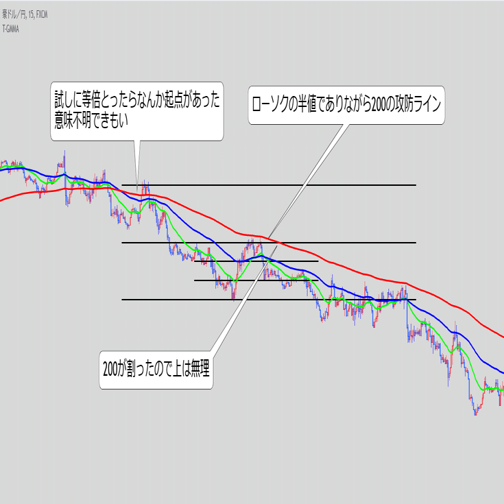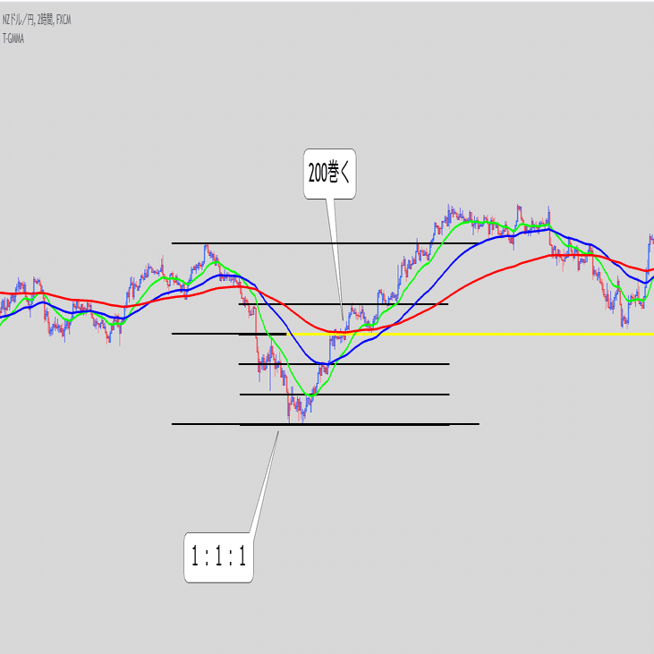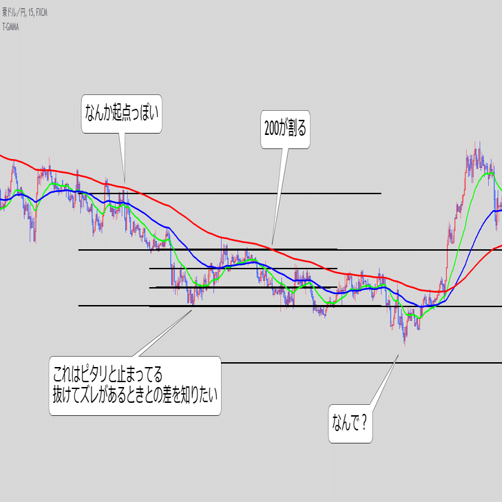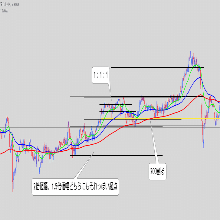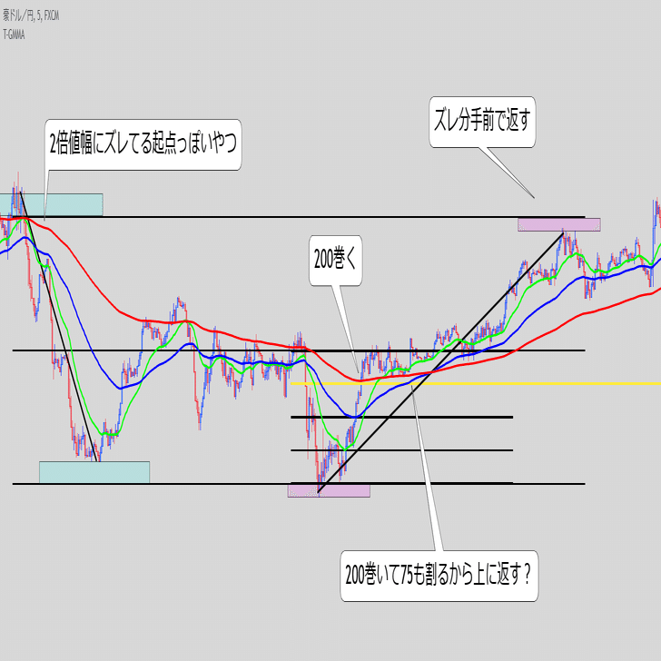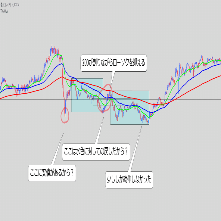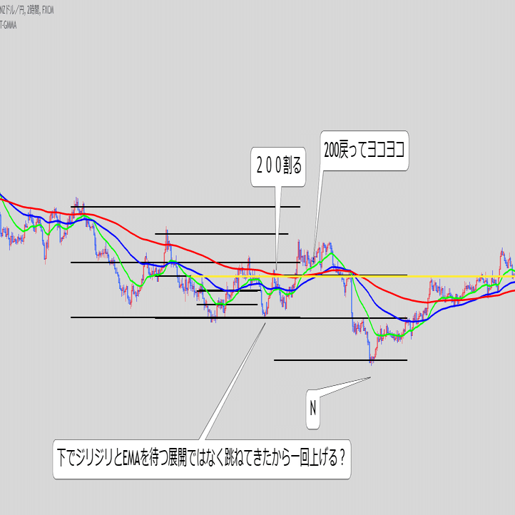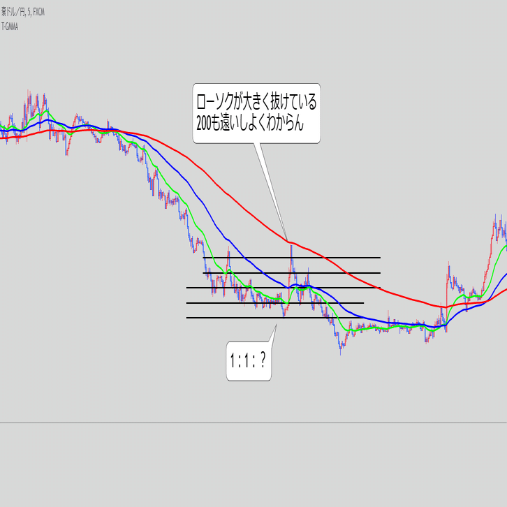 ・これ単体で続伸を見るというより、また同じ底にローソクが触れてきた時のEMAの位置関係と乖離幅が重要な気がする