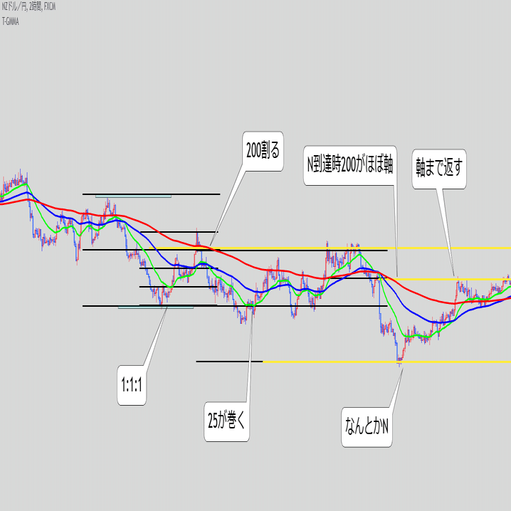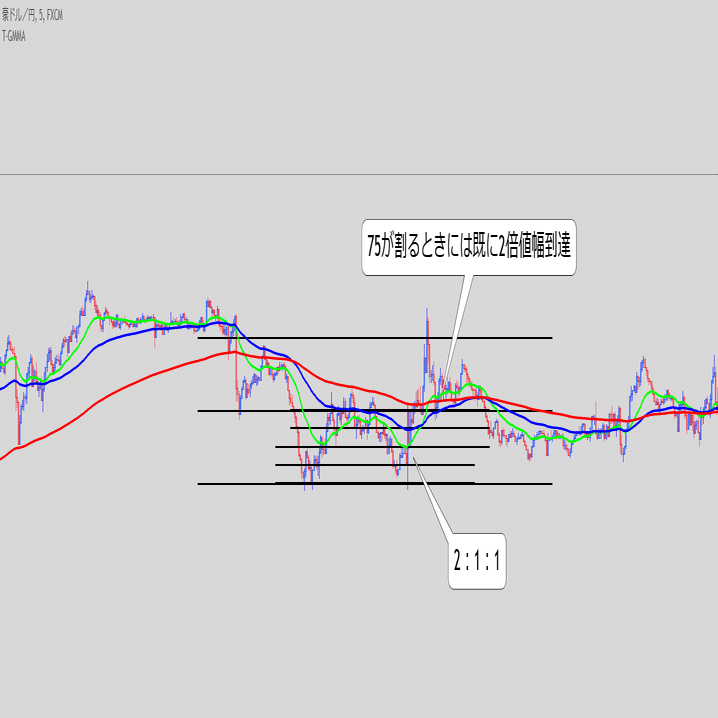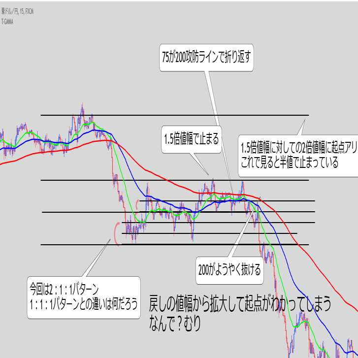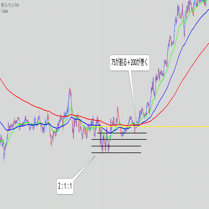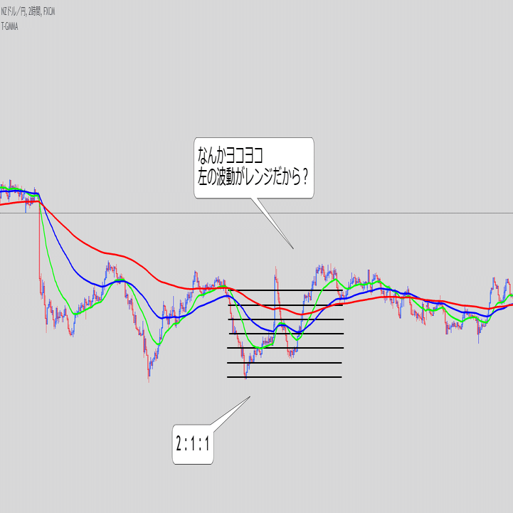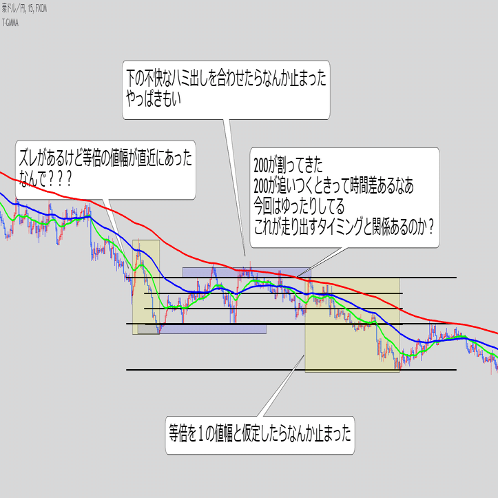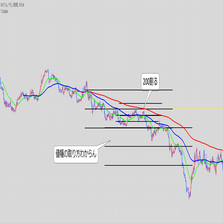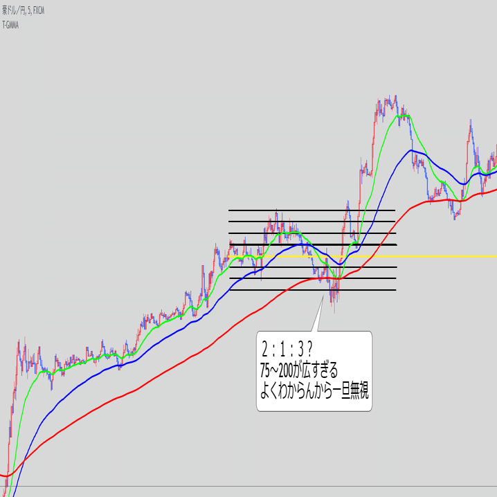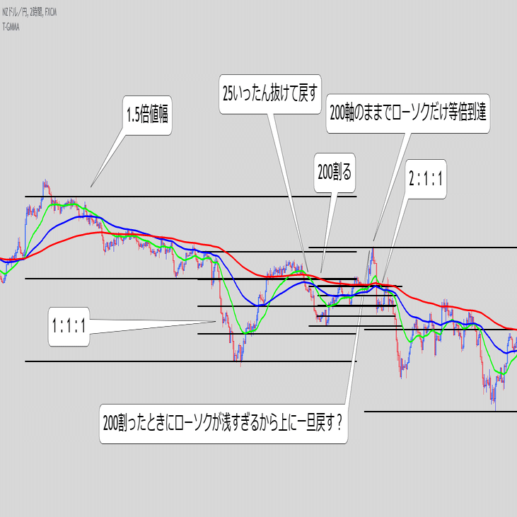 ・これ単体で続伸を見るというより、また同じ底にローソクが触れてきた時のEMAの位置関係と乖離幅が重要な気がする