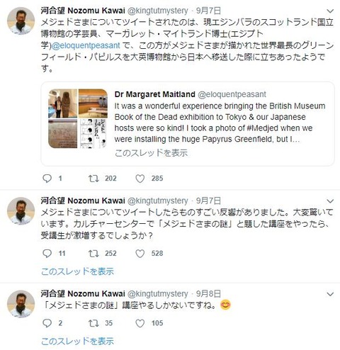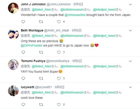 「Wonderful! 私もこれのいくつかを持っているよ、Chris Naunton(国際エジプト学会代表のエジプト学者)が日本から持ち帰ってきたやつを」