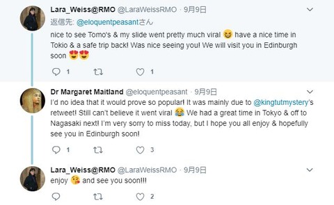 「私とトモ(中部大学国際学科教授でエジプト考古学者・中野智章)のプレゼンのスライドが話題になっているようで嬉しい限り 😆 マーガレット、どうぞ東京での時間を楽しんでください、そして旅の無事を祈ってます。あなたとまた会えてよかった、近いうちにエディンバラを訪れますのでその時また 😍😍」