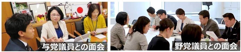 ▼議員や行政の政策担当者へは、ロビー活動による直接対話を通じて声を届けます。